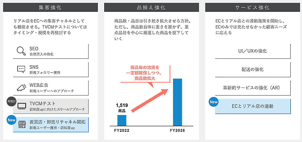 自社ECの中期戦略は、リアル店の本格検討に伴い一部見直す。商品数・品目は引き続き拡大する方針だが、商品数に重きを置かず、重点品目を中心に厳選した商品を展開。ECとリアル店との連動施策も開始し、ECのみでは満たせなかった顧客ニーズに対応する。