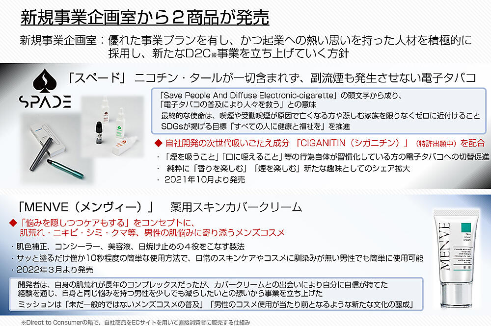 この目標に向け既存事業の拡大だけでなく、2021年度は新規事業の計画を持つ人材を採用して、社内ベンチャーの形で新たなD2C事業を立ち上げる「新規事業企画室」を設置した。新規事業企画室から第1号のブランドとして販売したのが、電子タバコの「SPADE」だ。
