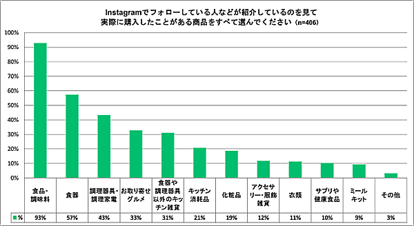 インスタグラムをきっかけにした商品購入のジャンルは、「食品・調味料」が最も多い93%、「食器」57%、「調理器具や調理家電」43%となった。これは、その商品を使った料理やレシピの投稿が購買行動に影響しているようだ。