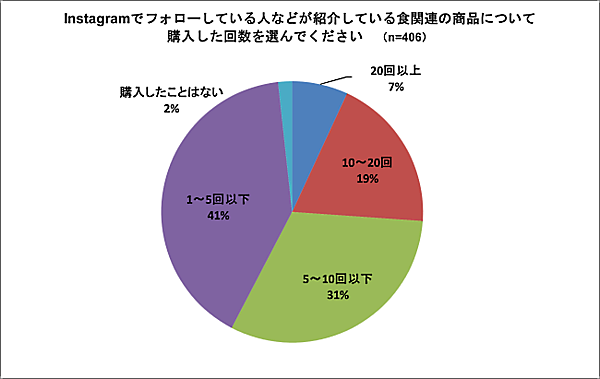 インスタグラムを契機とした食関連の商品の購入回数は、1〜5回以下が約4割、20回以上が7%だった。
