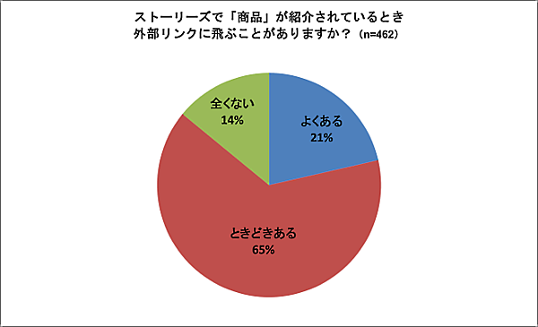 また、インスタグラムの「ストーリーズ」(スライドショーのような形式で、画像や動画が投稿できる機能)でのリンク機能は、回答者のうち2割は頻繁にクリックしていることがわかった。