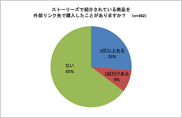 「ストーリーズ」のリンク経由での商品購入について、「1回だけある」または「2回以上ある」と回答した人は、合わせて3割超となった。
