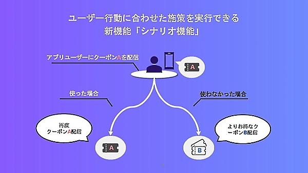 「シナリオ機能」とは、アプリユーザーの行動に応じた施策を実行できる機能。「アプリを過去〇日以内にダウンロードした」、「過去〇日以内に会員登録を行った」、「特定のバナーやクーポンを利用した」などのユーザー行動に応じて、次に実施する施策(プッシュ配信、クーポン配信など)を自動で変更できる。