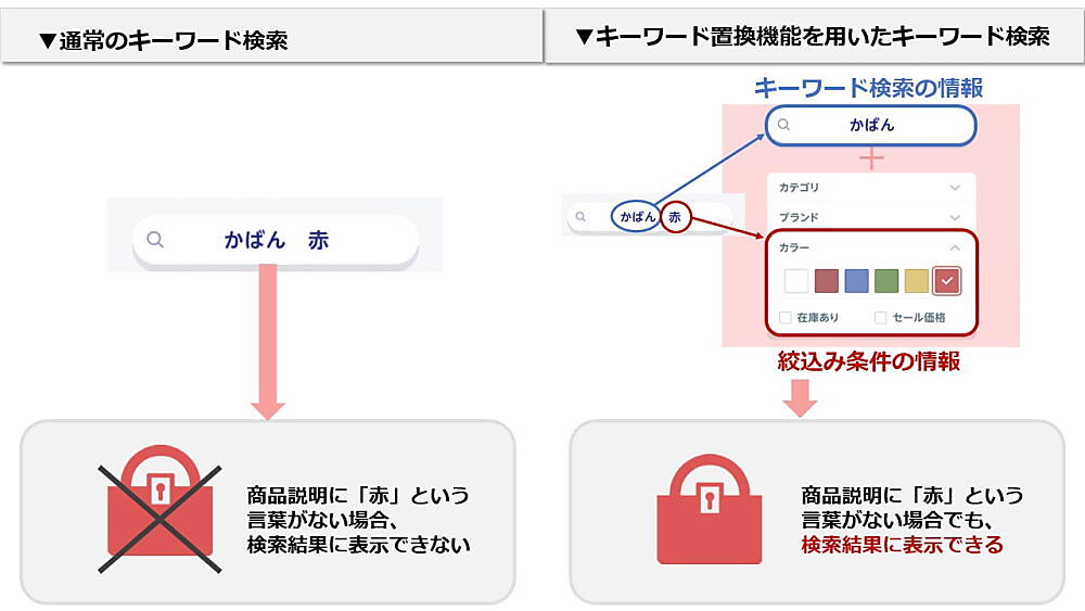 北岡:「キーワード置換機能」は、ECサイト内でユーザーがキーワード検索を利用した際、より目的の商品を見つけやすくするための機能です。キーワード検索では、カラー情報や「セール品」といった付加情報を商品名に追加して検索するケースがあります。しかし、通常のキーワード検索では商品説明文に該当キーワードを含んでいなければ、商品を検索結果に表示できません。