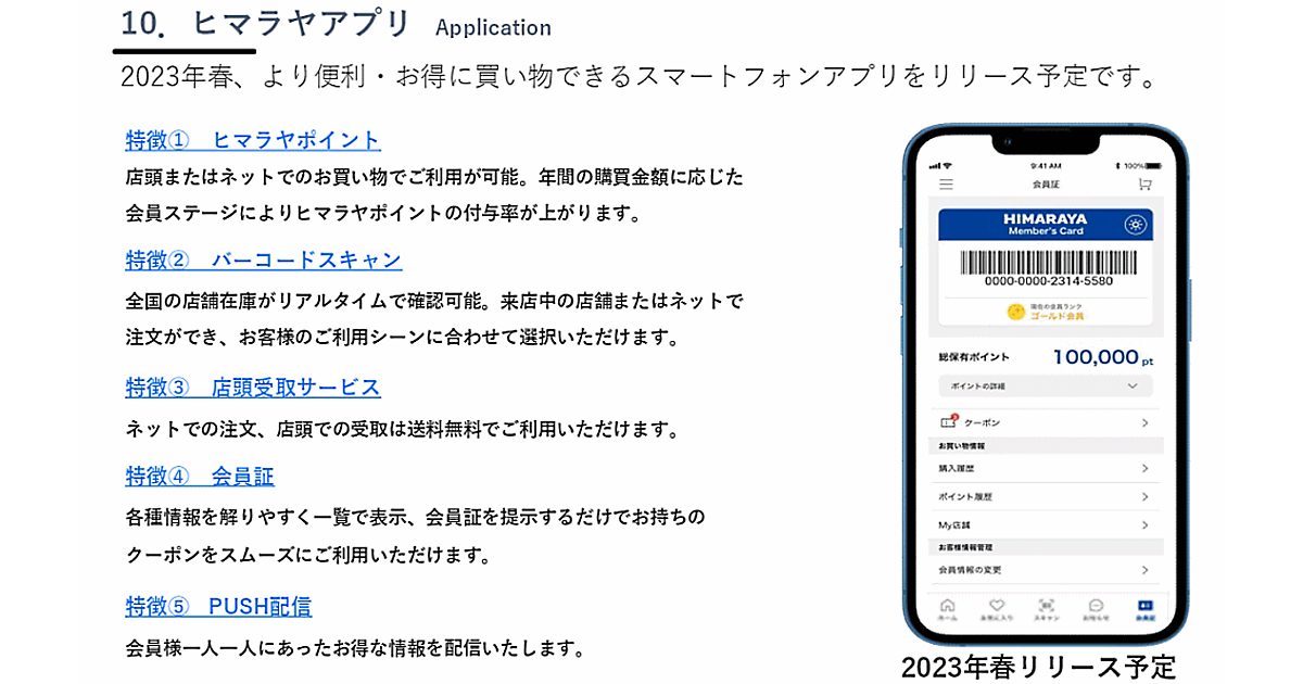 実店舗とECの連動を実現する1つの施策として、2023年春にスマートフォンアプリ「ヒマラヤメンバーズアプリ(仮称)」をリリースする。特徴は5点。