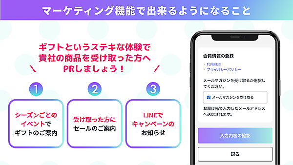 「All in gift」に追加した「マーケティング機能」は、会員登録またはメルマガの登録へ誘導し、リピート促進のためのさまざまなマーケティング施策を可能にする。