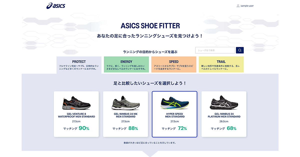 「ASICS SHOE FITTER」によるシューズの選び方は、まずランニングの目的(「PROTECT」「ENERGY」「SPEED」「TRAIL」の4種類)を選択した後、足と比較したいシューズを選ぶ。さらに足形データとシューズを比較してシューズの商品詳細ページへリンクする仕組み。