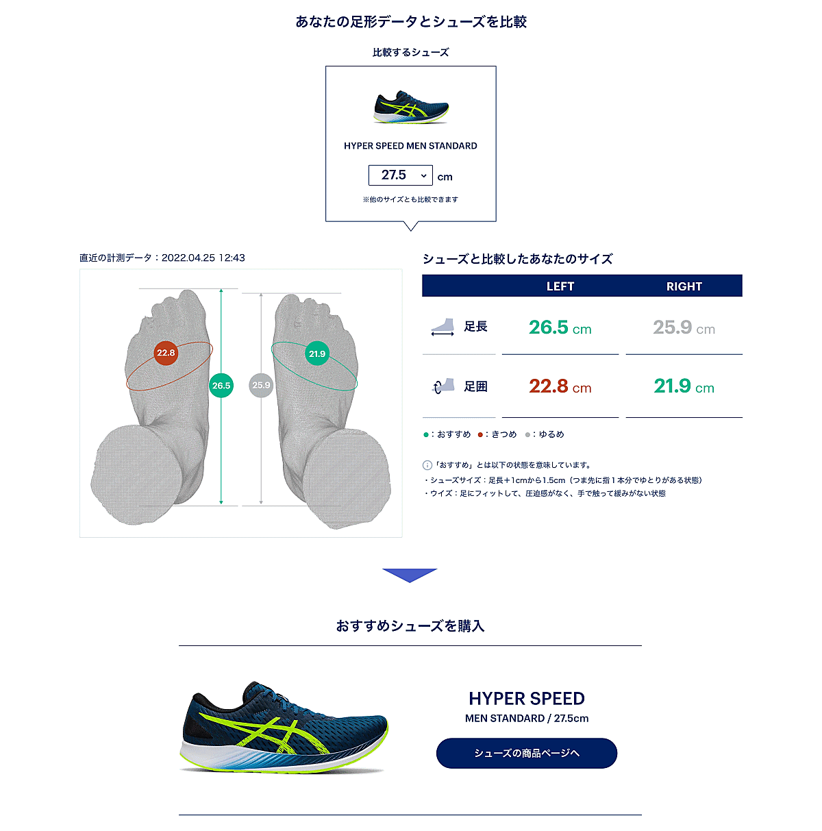 お薦めサイズは、アシックススポーツ工学研究所が開発した独自のアルゴリズムを用いて、ラスト(靴型)と足の長さや幅などを比較して算出。ランニングの目的ごとに表示されるお薦めシューズを選択することで、各シューズが足の長さや幅に対してどの程度フィットしているかがわかるようになっている。ECサイトとも連携、お薦めシューズの商品詳細ページをワンクリックで閲覧、購入できる。