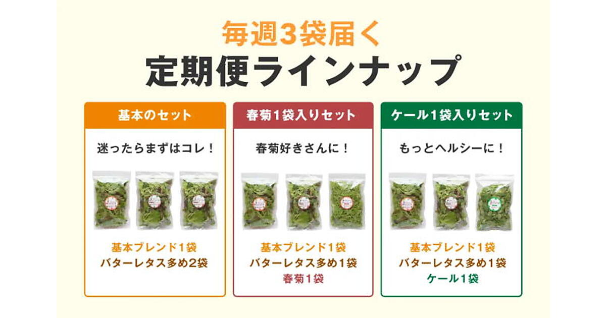 10種の葉野菜(バターレタス、ビート、レッドオーク、水菜、スピナッチ、ワイルドルッコラ、ピノグリーン、赤水菜、コスレタス、壬生菜)を4種のブレンド(基本ブレンド、バターレタス多め、春菊、ケール)にした。特徴別に組み合わせが異なる3袋のセットを定期便で提供している。ユーザーは指定した曜日・場所で毎週商品を受け取ることができる。