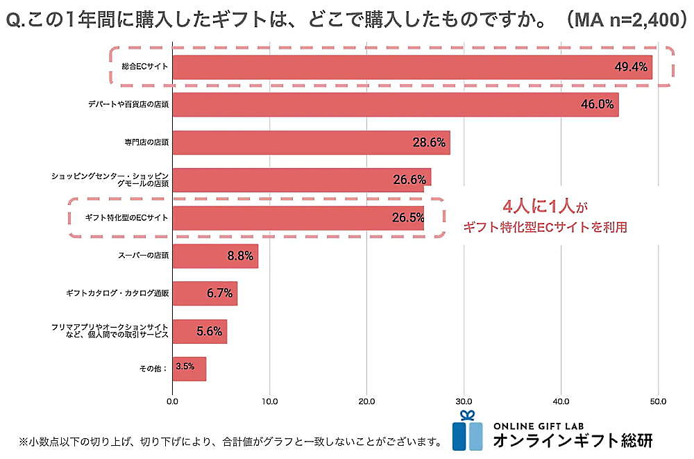 ギフトモールが実施した「ギフト購入関する調査」によると、ギフトの購入先は「総合ECサイト」が49.4%と最も多かった。