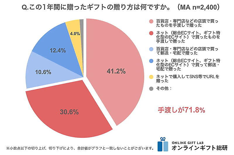 ギフトの渡し方は「百貨店・専門店などの店頭で買ったものを手渡しで贈った」が41.2%、「ネット(総合ECサイト、ギフト特化型のECサイト)で買ったものを手渡しで贈った」が30.6%で、「手渡し」は合計71.8%で強く支持されている。一度自分の手元に届いたギフトを、相手に直接会って渡すケースが多いようだ。