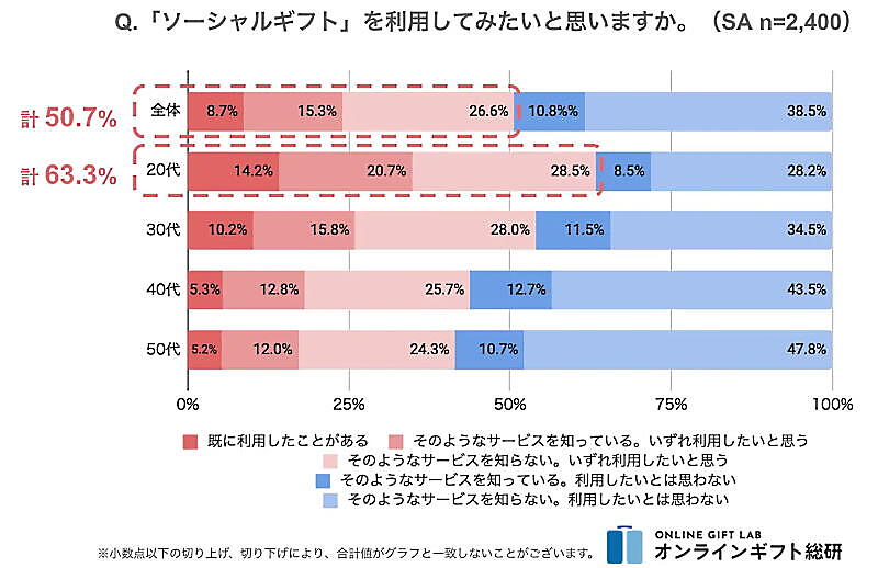 住所を知らない相手にSNSなどで受け取り用のURLを使いギフトを贈る「ソーシャルギフト」について、「すでに利用したことがある」と回答したのは8.7%。「いずれ利用したいと思う」と回答した利用意向者は42.0%に達した。