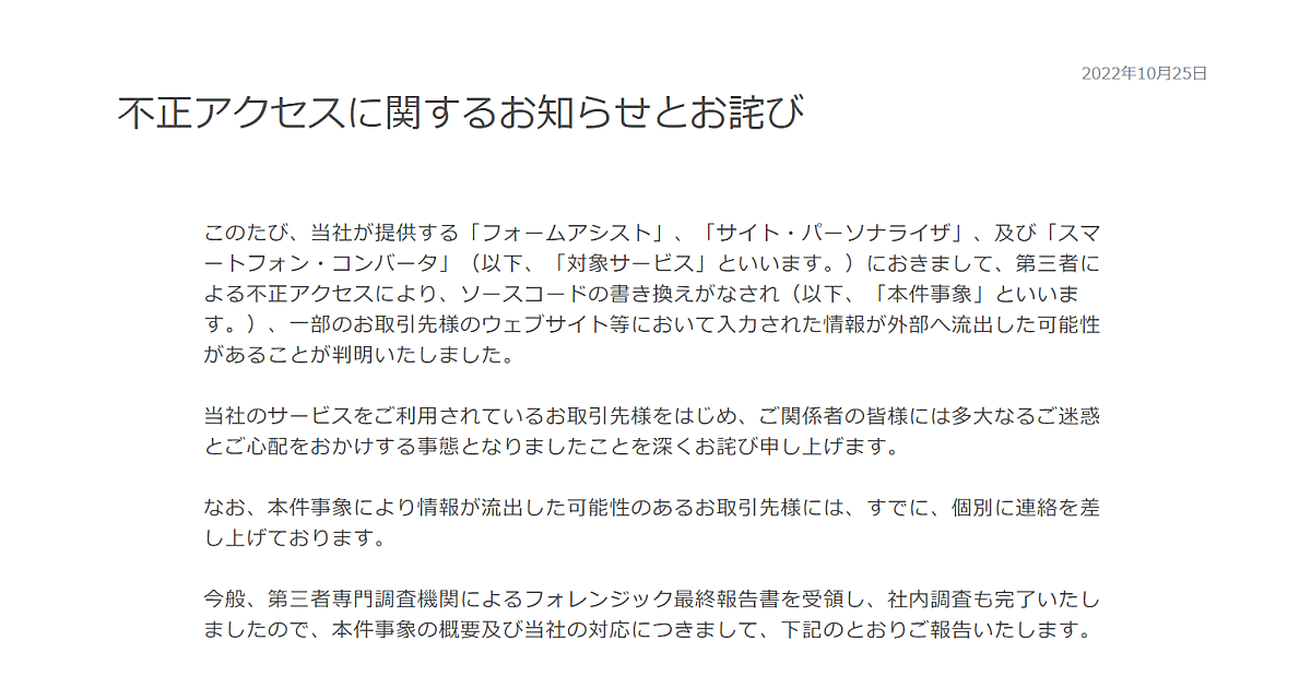 ショーケースは、提供する「フォームアシスト」「サイト・パーソナライザ」「スマートフォン・コンバータ」において、第三者による不正アクセスによりってソースコードの書き換えが行われ、一部の取引先のECサイトなどで入力された情報が外部へ流出した可能性があると公表した。