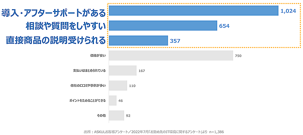 また、ITツールの購入先を選定する際に重視する点は、「導入サポートサービスやアフターサービスがあること」「相談や質問がしやすい」などが上位項目となっている。