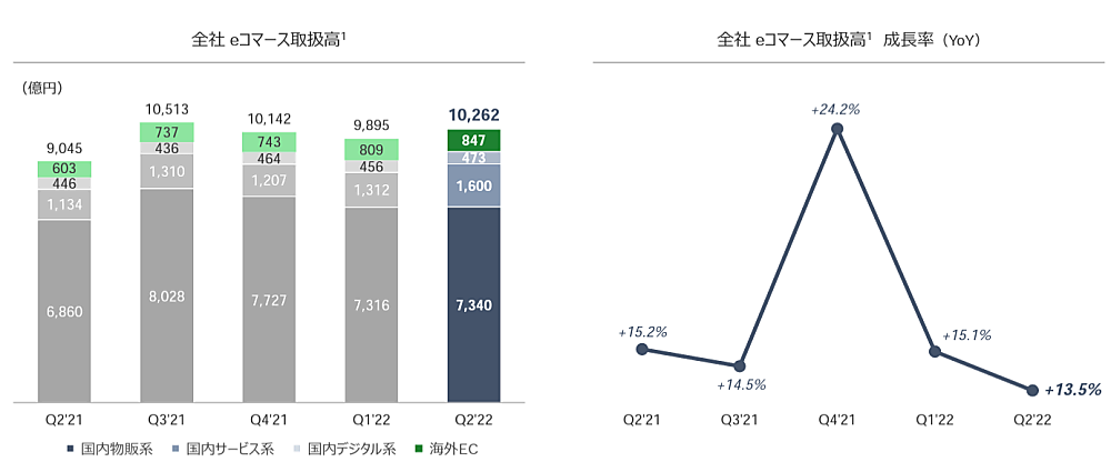 ショッピング事業の取扱高の内訳は、2022年4-6月期(第1四半期)の取扱高が同7.9%増の4109億円、2022年7-9月期(第2四半期)は同8.8%増の4212億円だった。