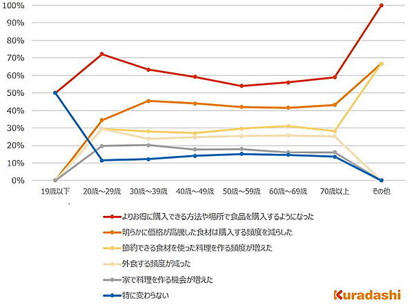 年代別結果では、「よりお得に購入できる方法や場所で食品を購入するようになった」という回答は、20歳~29歳は72.1%、50歳~59歳では54.0%。年代によって約20%の差が見られた。