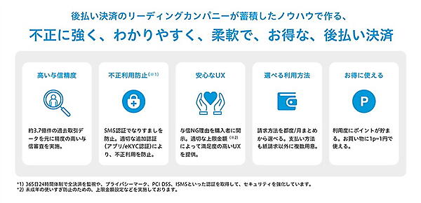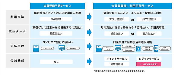 「都度後払い」はSMS認証方式を採用。従来型よりもシンプルかつセキュアな仕様で、決済時の「カゴ落ち」を防ぐことができるとしている。