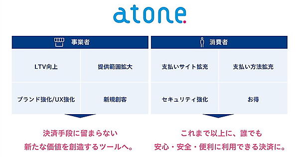 新機能は、従来の「atone」に会員登録不要の「都度後払い」機能を新たに追加する。「atone」は従来の月まとめでの支払機能に「都度後払い」が加わり、柔軟な後払いサービスになる。