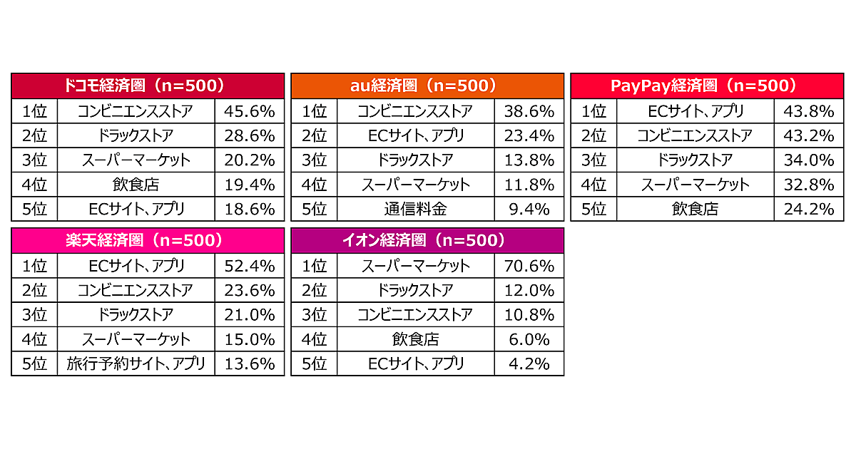 ドコモ経済圏(n=500)、au経済圏(n=500)、PayPay経済圏(n=500)、楽天経済圏(n=500)、イオン経済圏(n=500) - 有効回答:【予備調査】25000人、【本調査】2500人