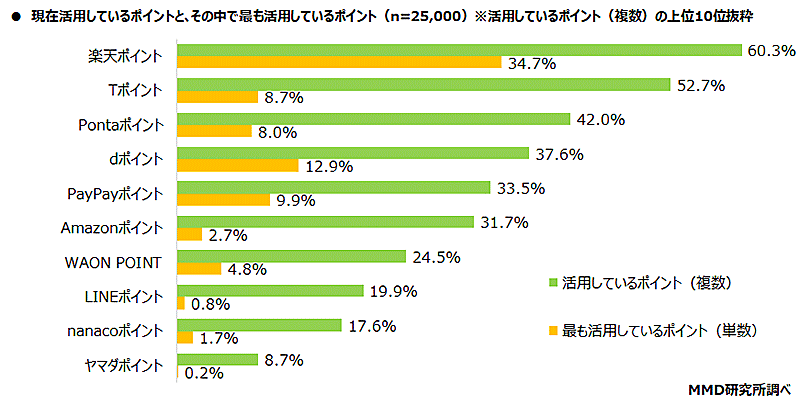 最も活用しているポイント上位は「楽天ポイント」「dポイント」「PayPayポイント」