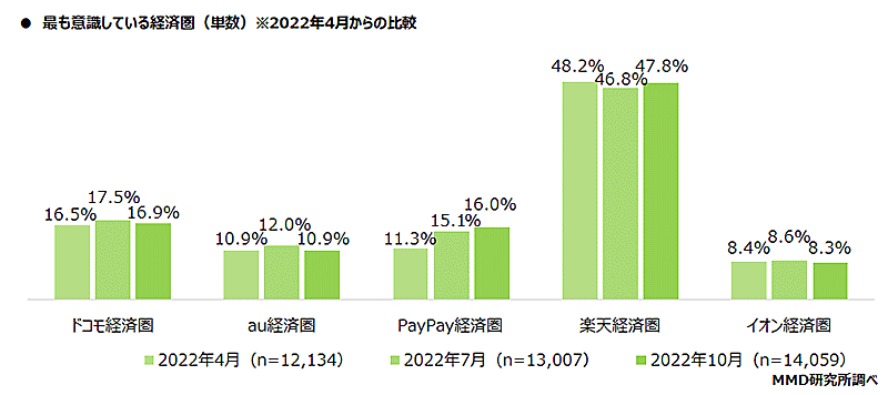 MMDLaboが運営するMMD研究所が実施した「2022年10月経済圏のサービス利用に関する調査」によると、56.2%が「経済圏を意識してサービスを利用している」と回答し、2022年4月の調査から7.7ポイント増加した。