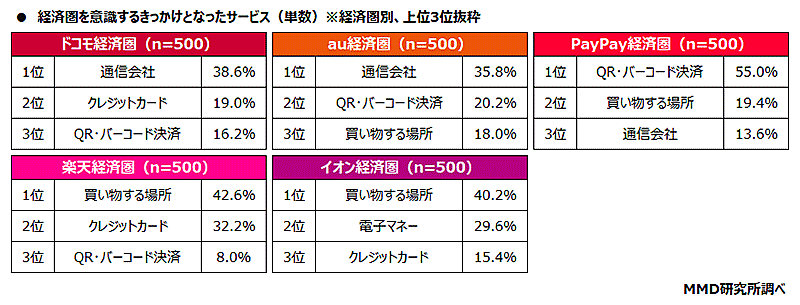 5つの経済圏のメイン利用者に最も意識している経済圏を意識し始めるきっかけになったサービスをいた。経済圏別に結果をみたところ、各経済圏のトップは「ドコモ経済圏」「au経済圏」は「通信会社」、「PayPay経済圏」は「QR・バーコード決済」、「楽天経済圏」「イオン経済圏」は「買い物する場所」だった。