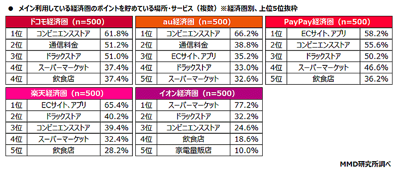 5つの経済圏のメイン利用者に、メイン利用している経済圏のポイントを溜めている場所と使っている場所について聞いたところ、「ドコモ経済圏」「au経済圏」は「コンビニエンスストア」、「PayPay経済圏」「楽天経済圏」は「ECサイト、アプリ」、「イオン経済圏」は「スーパーマーケット」がトップだった。