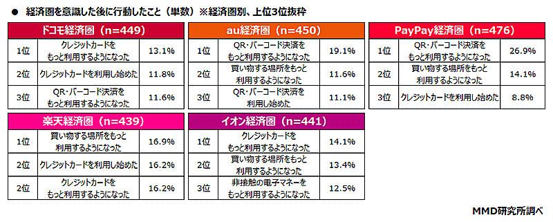経済圏別に結果を見ると、「ドコモ経済圏」「イオン経済圏」は「クレジットカードをもっと利用するようになった」、「au経済圏」「PayPay経済圏」は「QR・バーコード決済をもっと利用するようになった」、「楽天経済圏」は「買い物する場所をもっと利用するようになった」がそれぞれトップだった。