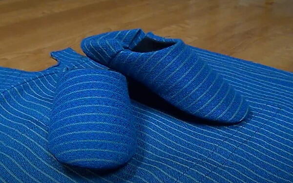 このシートカバーに着目してアップサイクルし、ルームシューズに再生した。型取り、裁断、縫製まですべて手作業。脱ぎ履きが多い時は、かかと部分を畳んでスリッパとして利用できる。もちろん、かかとを起こしてルームシューズとしても利用可能だ。