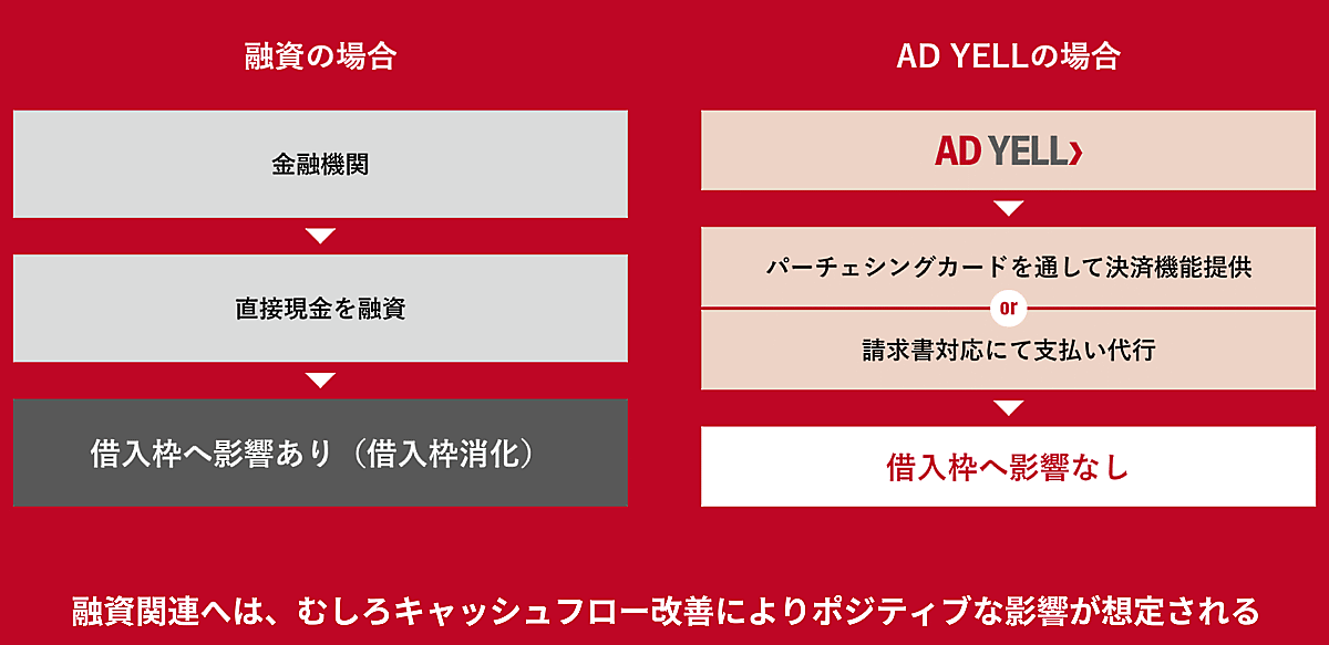 「AD YELL」を利用する場合はBSの未払金科目に計上されます。借入枠を温存した状態で広告費を確保でき、前述したメリットを含めて、キャッシュフロー改善をしながら投資に踏み込み、さらなる事業成長へとつながれば、今後の融資関連へはポジティブな影響も想定されます。