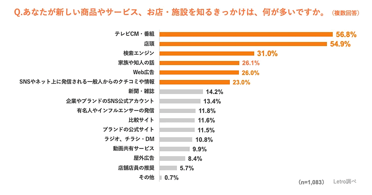 「新しい商品やサービス、お店・施設を知るきっかけ」を聞いたところ、最も多かったのは「テレビCM・番組」で56.8%。「店頭」で54.9%、「検索エンジン」が31.0%、「家族や友人の話」が26.1%、「Web広告」が26.0%で続いた。