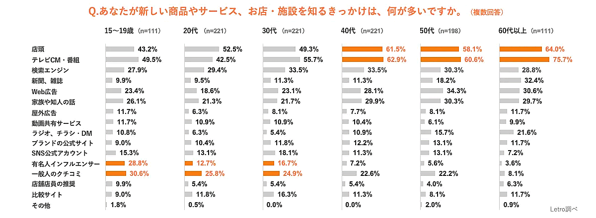 特に40代から60代以上は、「テレビCM・番組」と「店頭」によるきっかけが多い。若年層では、他の世代に比べて「SNSやネット上に発信される一般人からのクチコミや情報」「有名人インフルエンサー」の割合が高く、SNSが身近な世代の購買行動を示している。