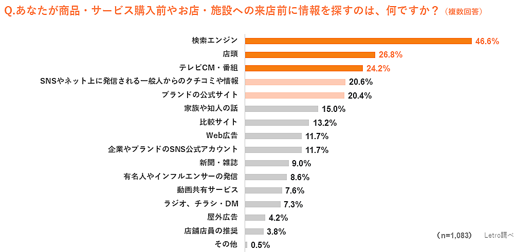 「商品・サービス購入前やお店・施設への来店前に情報を探す場所」は、「検索エンジン」が46.6%でトップ。「店頭」は26.8%、「テレビCN・番組」は24.2%、「SNSやネット上に発信される一般人からのクチコミや情報」は20.6%、「ブランドの公式サイト」は20.4%。
