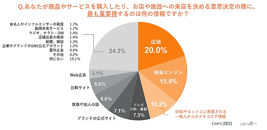 「購入や来店の意思決定の際に、最も重要視する情報」については、「店頭」が最も多く20.0%。「検索エンジン」が15.8%、「SNSやネット上に発信される一般人からのクチコミや情報」が10.2%で続いた。