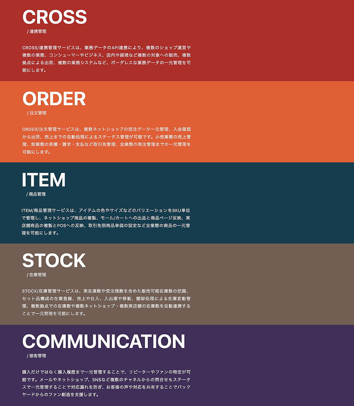 バックヤード業務のボーダレスな一元管理を実現するクラウドサービス。「連携管理(CROSS)」「注文管理(ORDER)」「商品管理(ITEM)」「在庫管理(STOCK)」「接客管理(COMMUNICATION)」の各サービスと機能で構成する。