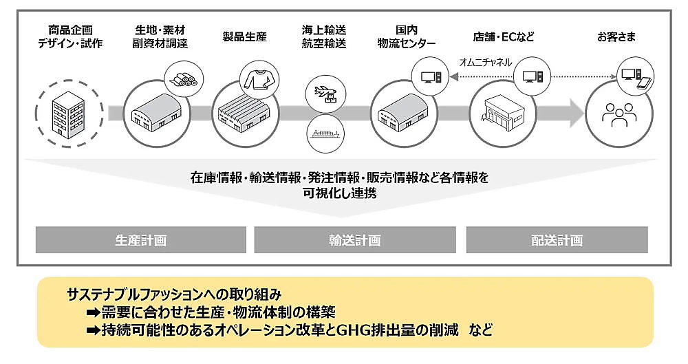 ファッション産業におけるサプライチェーンは、商品企画からデザイン、原材料の調達、商品の生産・調達、販売までのサイクルが長く、多くの企業は複数の国・縫製工場に生産を委託するなど複雑化している。サプライチェーン全体の可視化・効率化と、物流と在庫の最適化、流通過程でのGHG排出量の可視化・削減が課題となっている。
