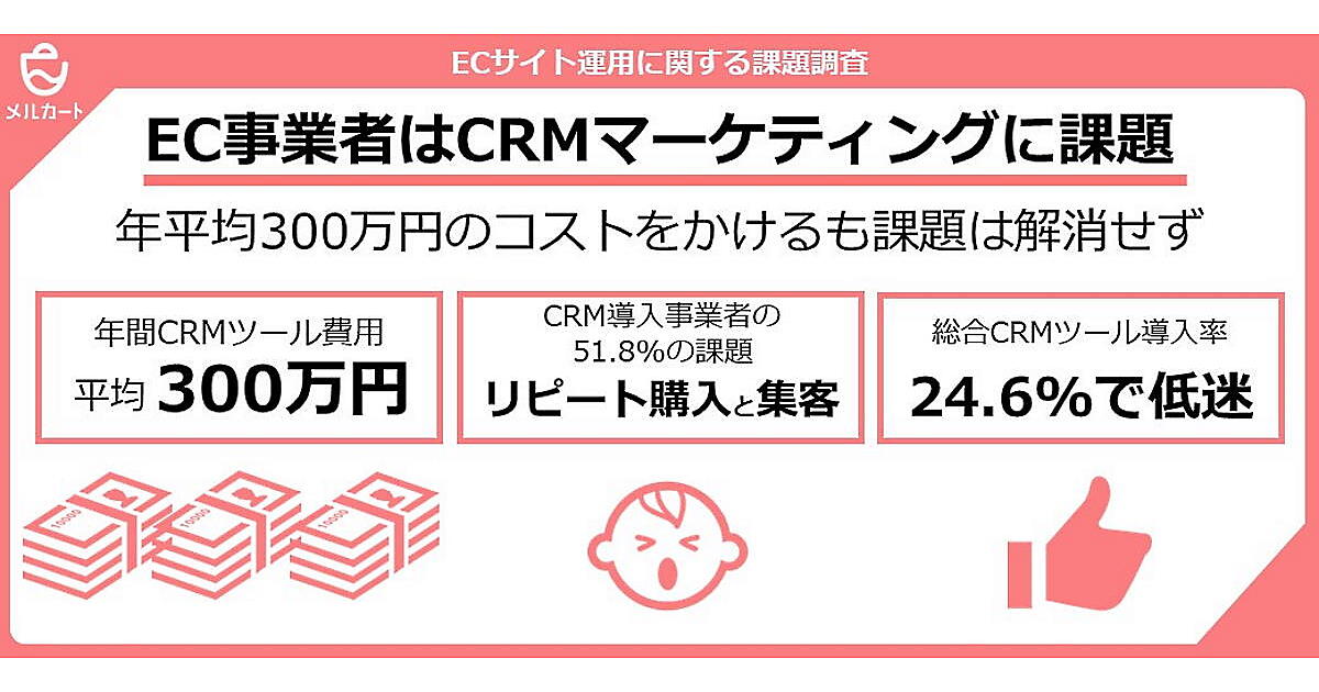 クラウド型EC プラットフォーム「メルカート」を提供するエートゥジェイは、全国のEC事業に携わっている20代~60代の男女400人を対象に、運営業務に関して「課題に思っていることや、CRMマーケティング施策」について調査した。