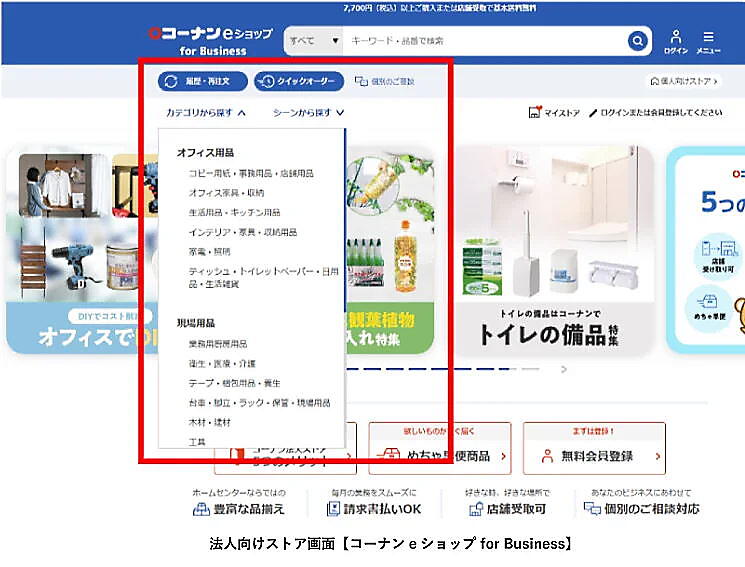また、個人と法人の顧客では商品の探し方が異なるため、法人顧客に対して共通ヘッダー内にある「法人向けストア」というリンクから法人ページへの移動を案内。共通ヘッダー内に「履歴・再注文」「クイックオーダー」「個別のご商談」など法人顧客が利用しやすい導線を設けた。カテゴリ検索では、「オフィス用品」「現場用品」といった法人顧客に特化した分類分けを行っている。