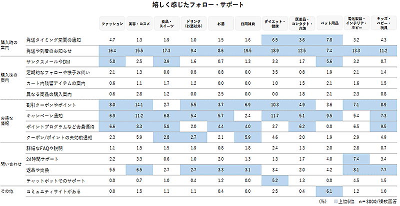 ユーザーが嬉しいと感じたフォロー・サポートでは、各カテゴリに共通して、クーポンやキャンペーンなど「お得な情報」や「発送や到着のお知らせ」の数値が高かった。