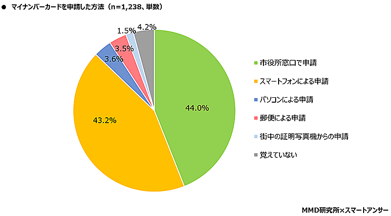 「マイナンバーカードを所有している」と回答した人に、「マイナンバーカード」の申請方法について聞いたところ、最多は「市役所窓口で申請」(44.0%)で、次いで「スマートフォンによる申請」(43.2%)「パソコンによる申請」(3.6%)だった。