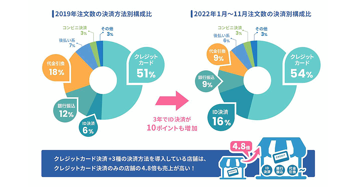 2022年1月~11月の注文数を決済手段ごとに見ると、1位はクレジットカード決済で54%、2位はID決済で16%、3位は銀行振込で9%。2019年と比較するとID決済が10ポイントも増加している。