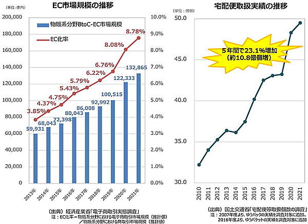 EC市場と物流量は右肩上がりで拡大している一方で、通販業界の発展は昨今のドライバー不足や「2024年問題」の深刻化の一因となっている。