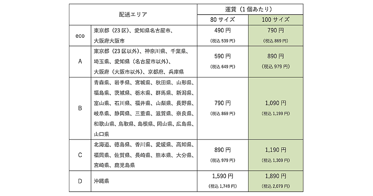 現在まで取り扱っているのは「80サイズ」以下の荷物。顧客の要望に対応するため、「100サイズ」の取り扱いを決めた。「100サイズ」の取り扱いに伴い、荷物のサイズ区分を現状の1区分から2区分に細分化する。