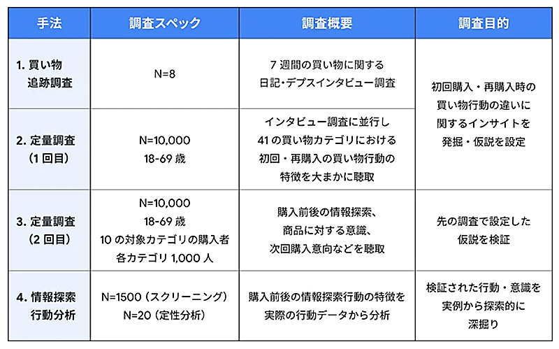 定性調査から浮かび上がってきた買い物行動に関する仮説は、消費財から耐久財まで10個の商材の購入経験者1人に対して定量調査を行うことで、どのくらい一般的なものなのかを確認している。