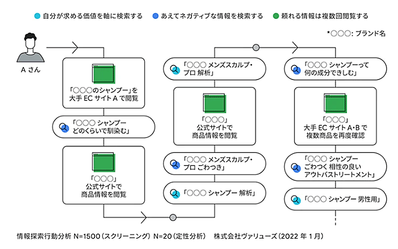 選択した商品に関連するページは、何度も検索、閲覧する行動があった。情報探索を通していろいろな情報に接するなかで気持ちが揺れた時に、自身が拠り所とする情報を再確認したいという目的があると分析している。