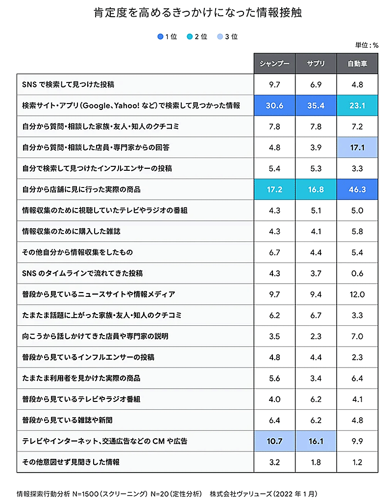 今回の調査パートナー企業の1社であるヴァリューズは、事前のアンケート調査を通して、4万人の中からシャンプー、サプリ、自動車を購入した生活者1500人を選定。具体的な情報探索行動を分析した。そのうち20人に対しては、購入前の「肯定度」が高かった生活者、低かった生活者を分類し、購入前の数か月間にわたって情報探索の特徴を分析した。その結果、購入前の「肯定度」が高い・低い購入では、情報探索の仕方にも差があった。