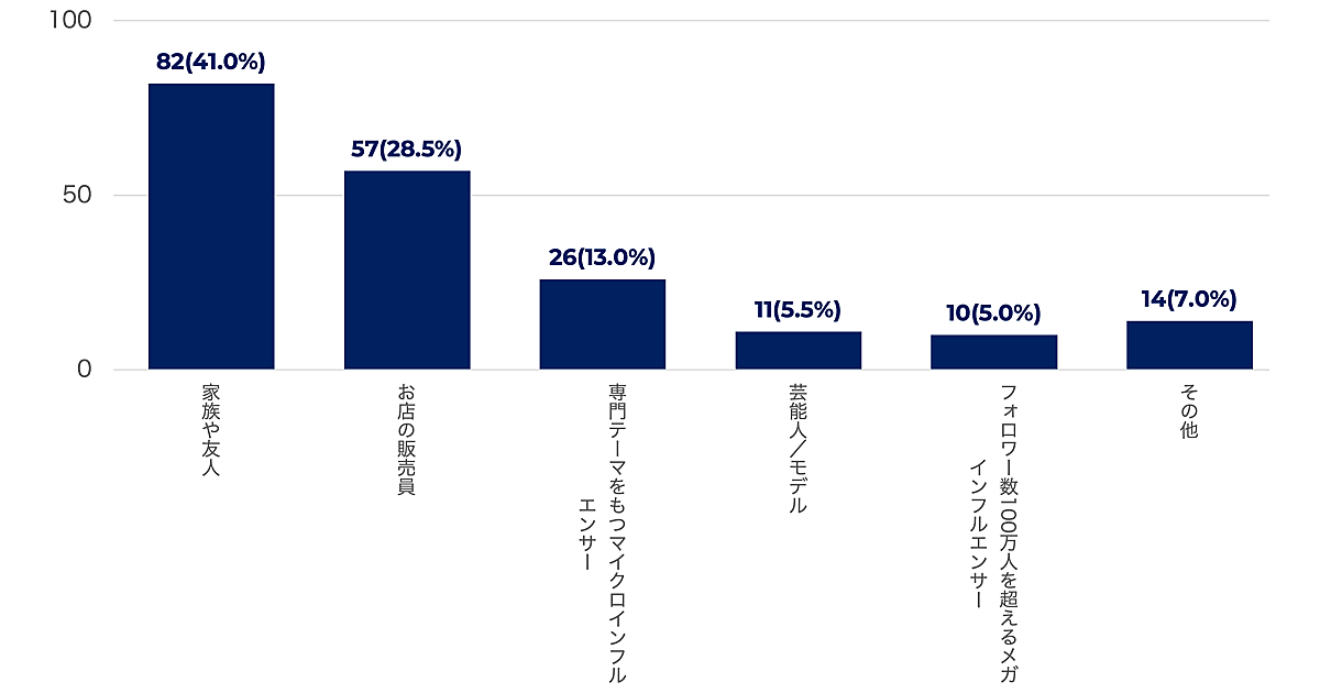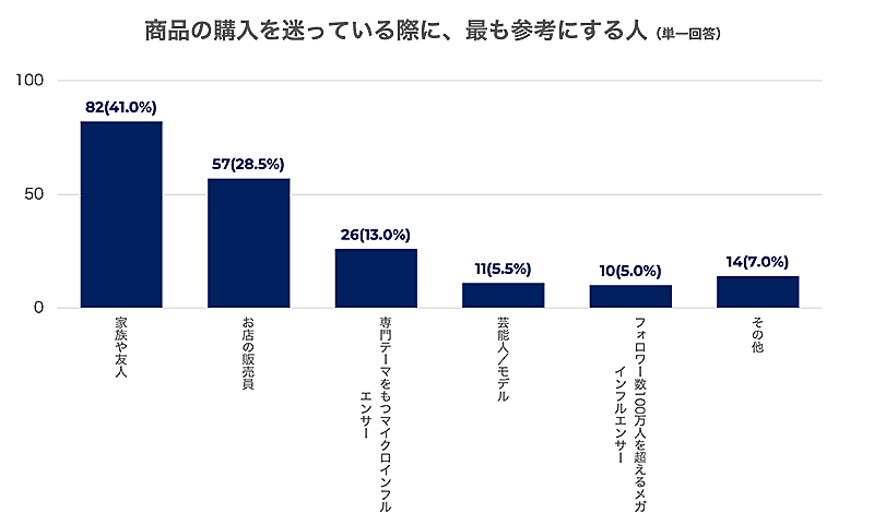 商品の購入を迷っている際に参考にする人を聞いたところ、「家族や友人」が41.0%で最多、次いで「お店の販売員」が28.5%、「専門テーマを持つマイクロインフルエンサー」が13.0%だった。