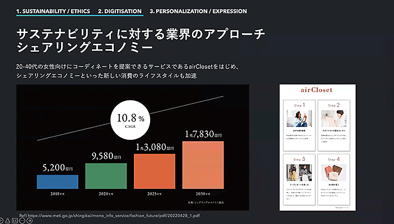 シェアリングエコノミーもサステナビリティに寄与する領域だ。衣料品レンタルのエアークローゼットは20代~40代の女性向けにコーディネートを提案するサービスを展開し、他者と衣服を共有する取り組みを進めている。ファッションにおけるシェアリングエコノミーの市場は今後拡大が予想されている。