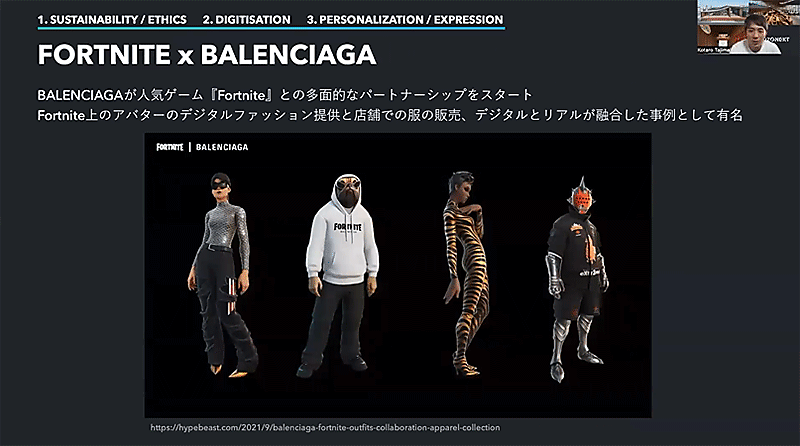 メタバースの領域はハイブランドも注目している。BALENCIAGAでは人気ゲーム「FORTNITE(フォートナイト)」との多面的なパートナーシップを発表。「FORTNITE」のゲーム上でデジタルファッションの提供をしている。あわせて、リアル店舗での「FORTNITE」の服の販売をBALENCIAGAが手掛けている。