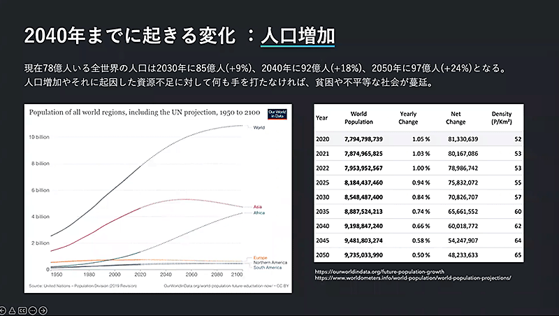 まず、2040年頃までに起きる変化として、人口増加が挙げられる。現在、全世界の人口は78億人とされ、これが2030年に85億人、2040年には92億人、2050年には97億人になると言われている。ZOZO NEXTは、資源不足に対して何も手を打たなければ、人口増加に伴って貧困や不平等な社会がまん延すると指摘している。